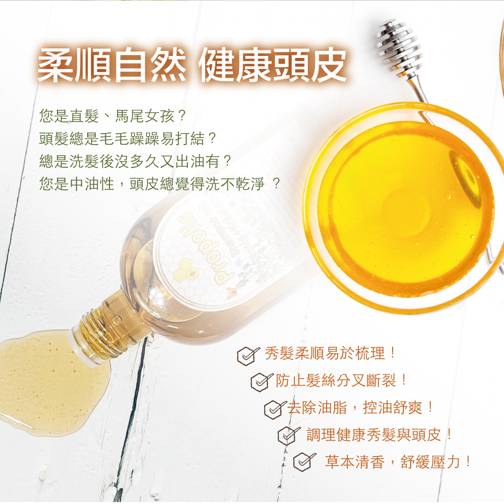 蜂膠可提供毛髮營養素。並可調理頭皮、淨化頭皮角質、改善頭皮油脂、舒緩出油不適,幫助頭皮保持健康平衡狀態,舒緩頭皮搔癢。