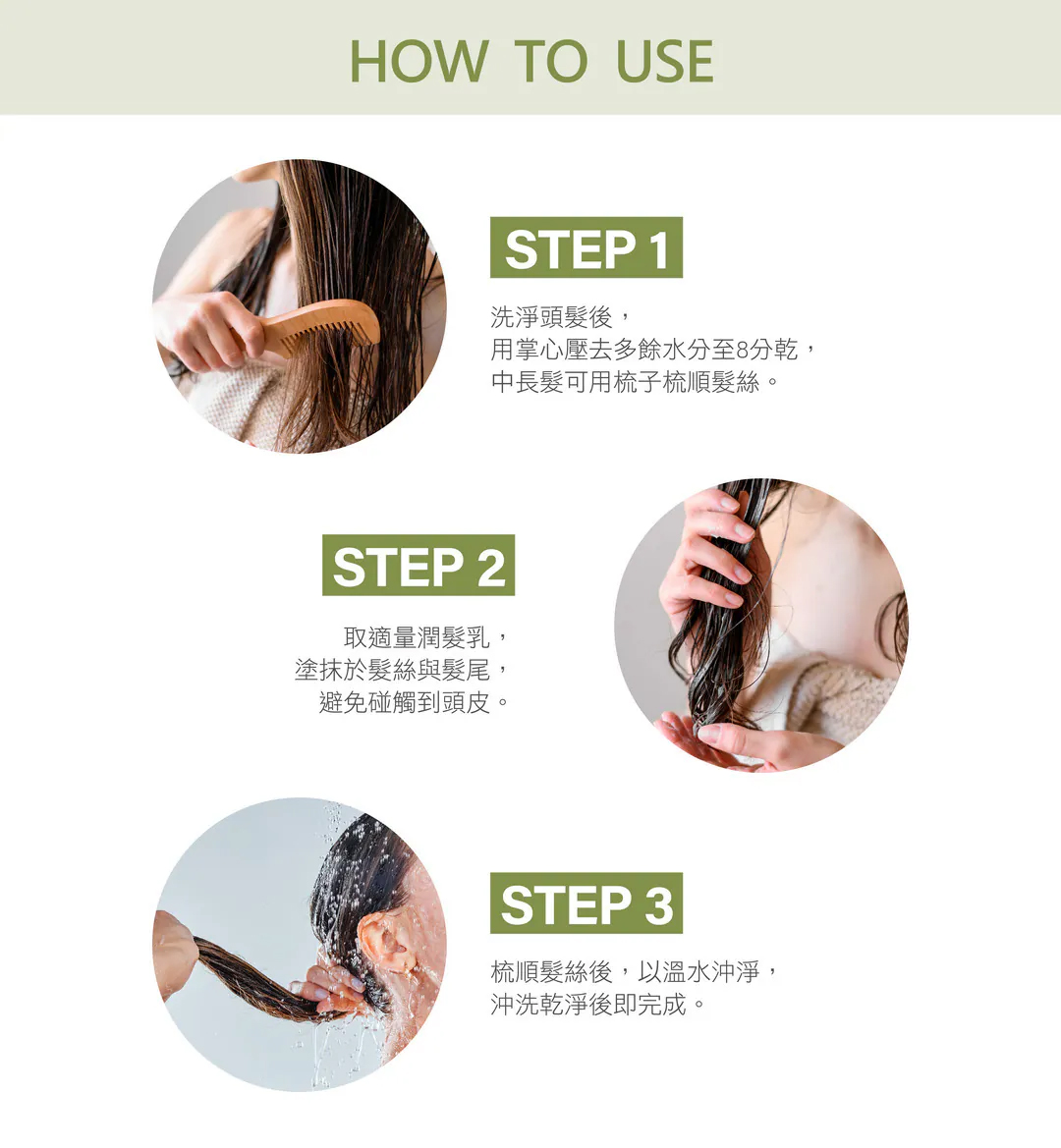 頭髮洗淨後,取適量潤用髮尾,不碰觸頭皮,髮絲滑順後,用水沖淨