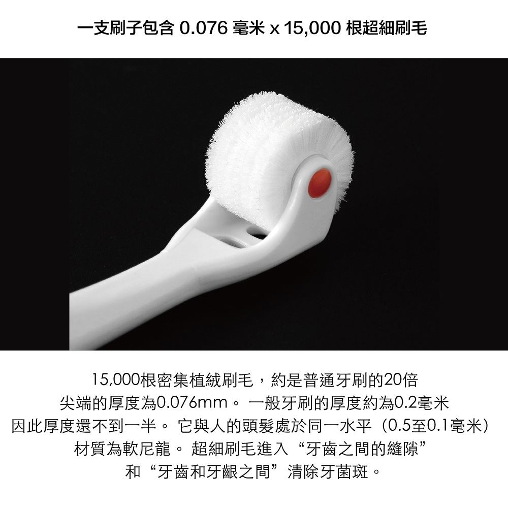 ■ 15,000 根密集植絨刷毛,密度約為普通牙刷的 20 倍